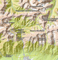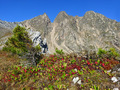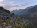 - Слева пик Пирамида, внизу перевал Тараканова 2А, за ним перевал Трудный 1Б, за Трудным справа перевал Пильмана-Иркутянок 1А