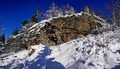 Вершина горы сложена останцом, на котором вцементирована тригометка; ветхий деревянный тригонометрический пункт валяется под ним.